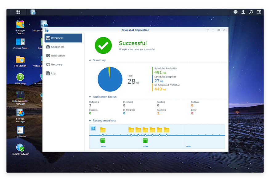 FS3017 內(nèi)建可拍攝高達(dá) 65,000 張備份快照并抄寫至異地服務(wù)器的 Snapshot Replication 套件,帶來高速的數(shù)據(jù)保護(hù),并確保共享文件夾中的數(shù)據(jù)或 iSCSI LUN 中的虛擬機(jī)即便遇上災(zāi)難事件也能十分安全。