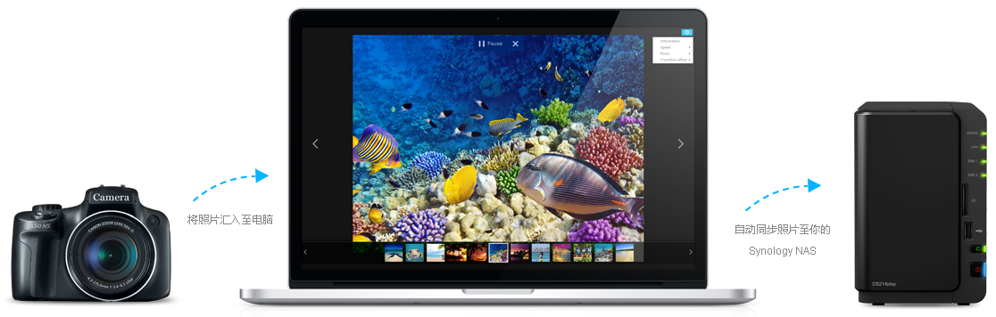 對于專業(yè)攝影師而言,一個容易上手的備份方案至關(guān)重要。有了 Cloud Station,將照片同步到 Synology NAS 變得十分簡單。在匯入相機的照片后,你只需將文件丟進電腦里指定的文件夾,它們就會自動上傳到 Synology NAS。