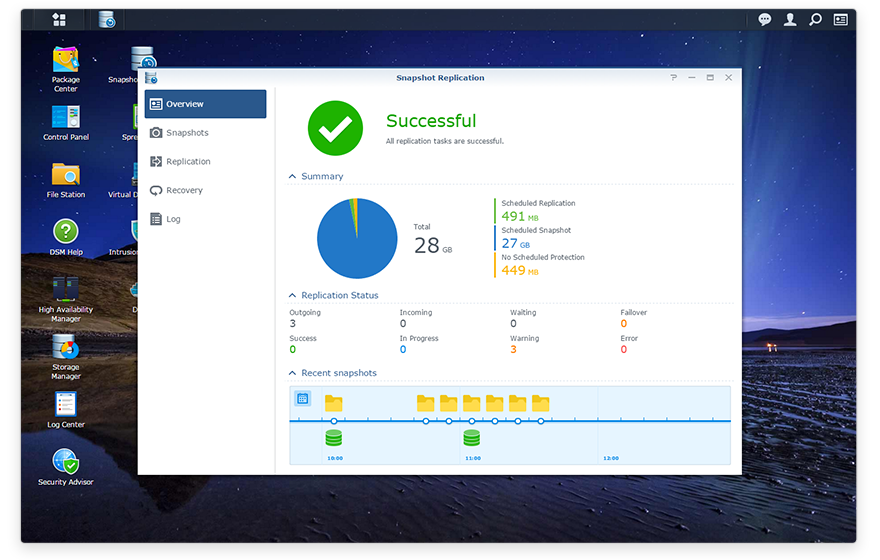 先進(jìn)的 Btrfs 文件系統(tǒng)于特定 NAS 機(jī)種上支持新的快照技術(shù)。Snapshot Replication 讓你可頻繁地將數(shù)據(jù)從主要備份地點(diǎn)復(fù)寫到異地存儲(chǔ)空間 - 最多可以每 5 分鐘備份共享文件夾,每 15 分鐘備份 LUN,確保你存儲(chǔ)在共享文件夾的重要機(jī)密或 iSCSI LUN 中的虛擬機(jī)能從災(zāi)難事件中快速地復(fù)原。